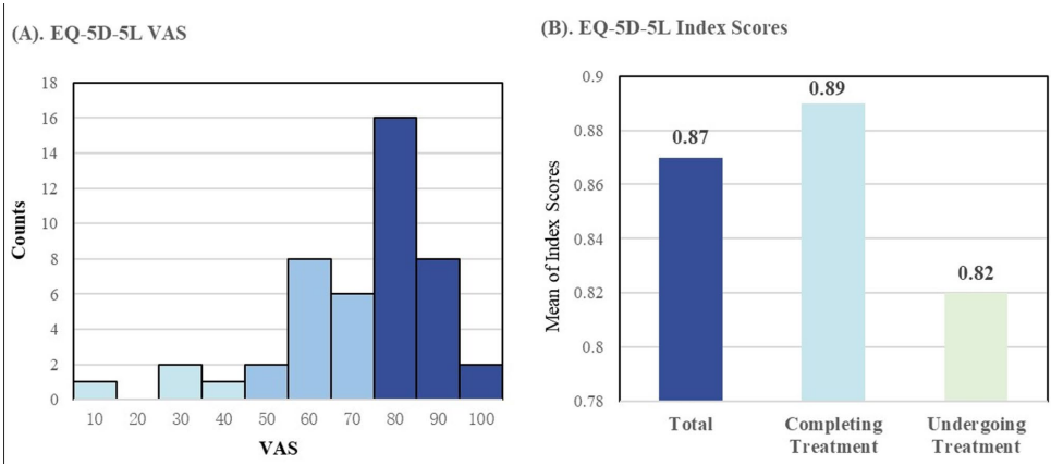 功能与生活质量:21.8%患者存在中重度生理功能干扰,22.4%存在心理功能干扰。EQ-5D指数中位值为80,22.4%患者处于"11111"完全健康状态。