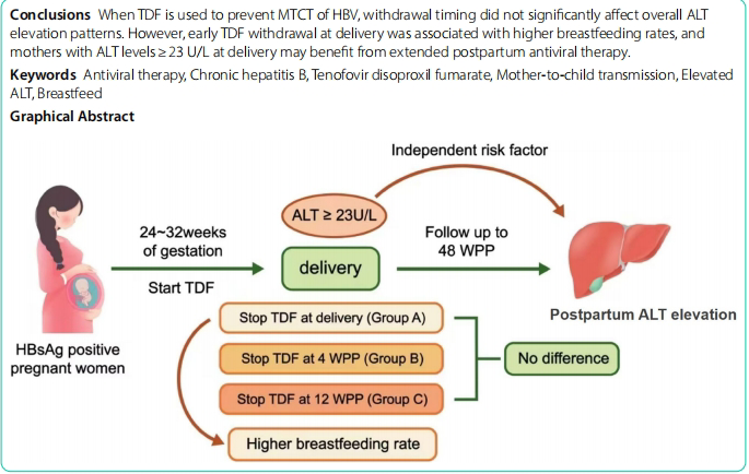 妊娠期慢性乙型肝炎患者产后停用富马酸替诺福韦酯(TDF)时机对ALT升高及母乳喂养的影响:一项前瞻性队列研究