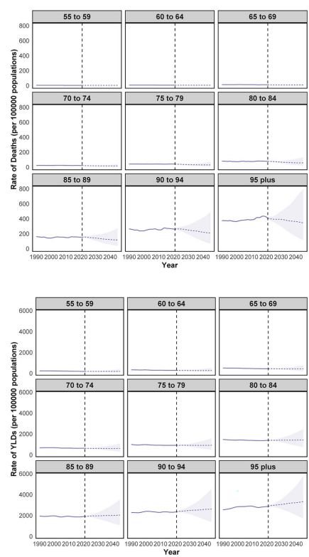 80-84岁年龄组负担最重,但95岁以上人群ASR增长最快。预计到2045年,95+岁女性YLDs率将达3336.83/10万,是90-94岁组的2倍。