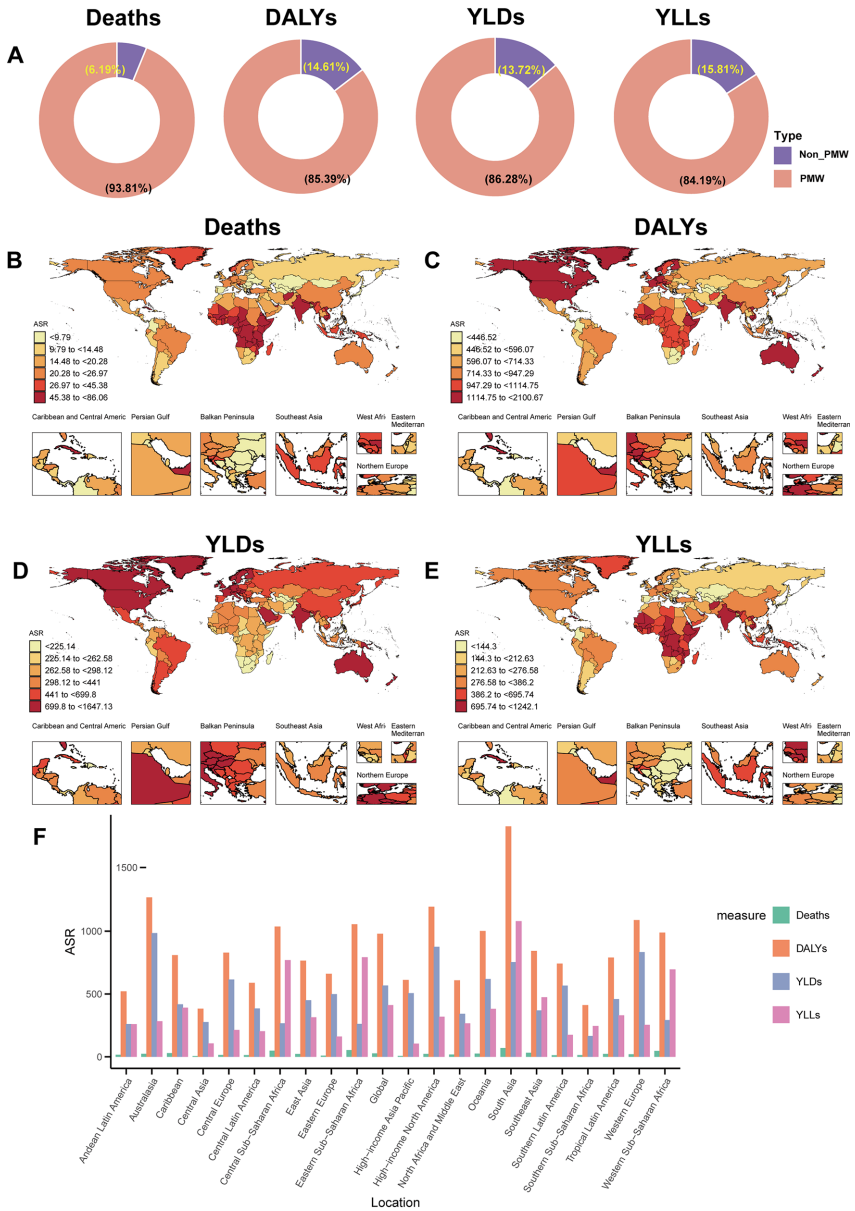 研究发现PMW占全球女性人口20%,却承担了93.8%的LBMD相关死亡和85.4%的DALYs。2021年全球LBMD导致PMW死亡21.9万例,DALYs达776万,年龄标准化DALY率为979.2/10万。与绝经前女性相比,PMW的死亡率高出15.17倍,YLDs负担高出6.29倍。