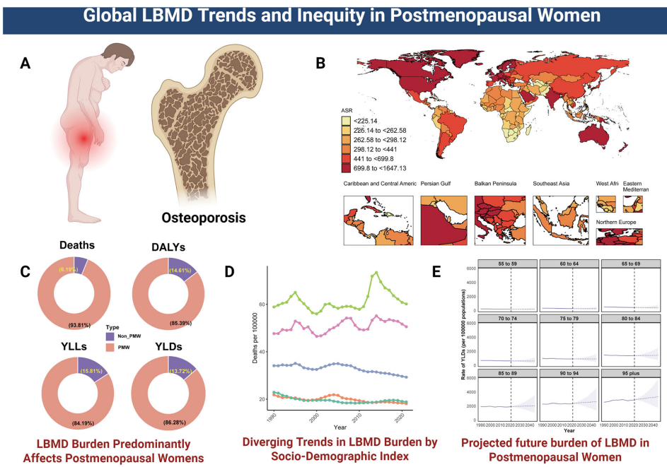 本研究基于GBD 2021数据,首次系统评估了204个国家/地区绝经后妇女(PMW)低骨密度(LBMD)的疾病负担。结果显示:LBMD导致全球PMW年死亡21.9万例,DALYs达776万,南亚地区负担最重。研究揭示了SDI区域间"高死亡率-高残疾"的分化模式,并预测至2045年疾病负担将持续增长。该成果为制定年龄分层、区域差异化的骨质疏松防控策略提供了关键证据。