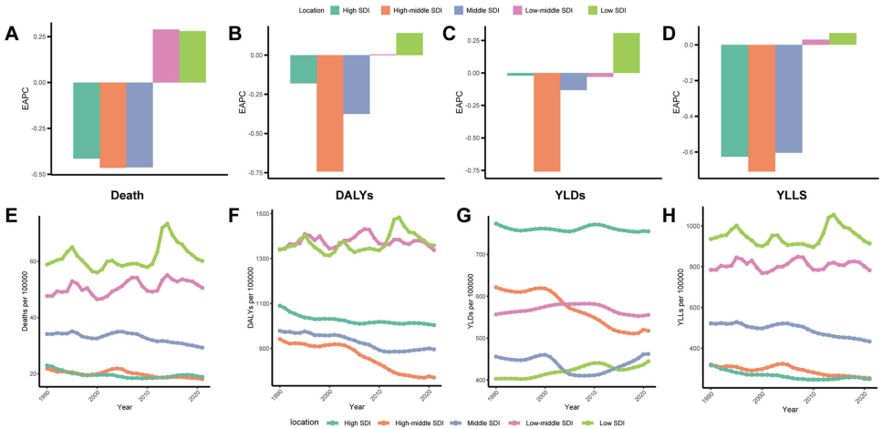 南亚成为疾病负担"震中",印度DALYs率达2100.67/10万。高SDI地区呈现"低死亡率-高残疾"特征,如澳大利亚YLDs率达985.02/10万;而低SDI地区如东非撒哈拉死亡率达54.10/10万。1990-2021年间,高收入北美地区死亡率EAPC增长2.05%,反映老龄化加剧的影响。