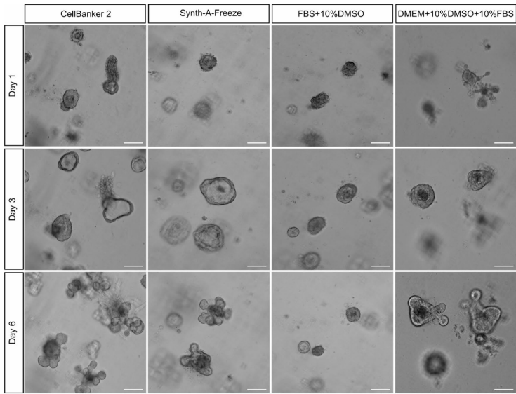 研究详细比较了上皮片段来源与单细胞来源类器官的培养差异。通过差异离心法分离的乳腺上皮片段在含胶原酶/胰蛋白酶的消化液中处理30分钟后,可获得保持细胞极性结构的类器官。实验数据显示,采用无血清冻存介质Synth-A-Freeze保存的类器官解冻后仍能维持正常形态发生能力,在含2.5 nM FGF2的培养基中培养6天后可形成典型分支结构。