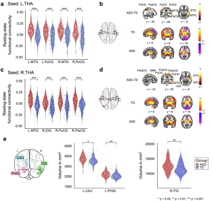 研究发现ASD组存在显著的丘脑-皮层超连接:左侧丘脑与左中颞叶(MTG)功能连接增强139.75倍,右侧丘脑与右中央前回(PreCG)连接增强79.05倍。这些异常连接网络涉及听觉处理(MTG)和感觉运动整合(PreCG/PoCG),