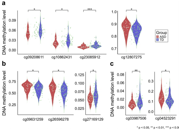 DNA甲基化分析揭示AVPR1A基因多个CpG位点异常:cg23085912位点低甲基化贡献度达110.72,而OXTR基因呈现双向调控(cg04523291高甲基化,cg03987506低甲基化)。