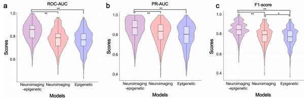 三模型对比显示:神经影像-表观遗传多模态模型的ROC-AUC(0.84)显著优于单一模态模型(神经影像模型0.78,表观遗传模型0.77)。