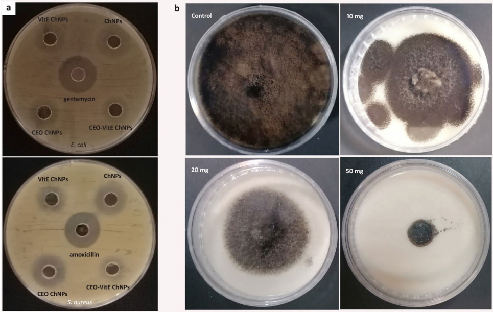 CEO-Vit E ChNPs对S. aureus的抑菌圈达16.1 mm,最小抑菌浓度(MIC)为987.5 μg mL-1,50 mg mL-1浓度可完全抑制A. niger生长。MTT实验显示载药纳米粒的细胞存活率(72.84%)显著高于空白ChNPs(35.61%)。
