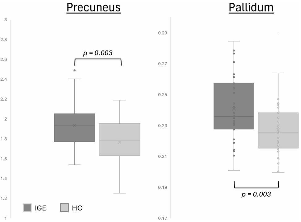 数据分析显示,IGE患者的楔前叶体积较对照组显著增大(1.935±0.237 vs. 1.766±0.240,p=0.002)。楔前叶作为高级认知功能的关键区域,其体积异常可能与IGE患者的意识障碍有关。