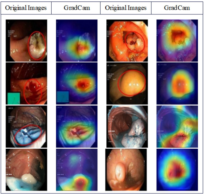 如图13所示,Grad-CAM可视化显示模型能准确聚焦息肉、溃疡等病变区域。消融实验(图14)证明均值阈值融合较传统串联融合准确率提升1-3%。在HyperKvasir数据集测试中,ResNet50+EFP达到84.57%准确率,较基线提升2.6%,验证了方法的泛化能力。