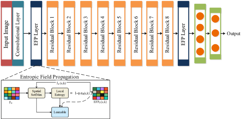 研究团队对ResNet18/50进行两项关键改进:1)用EFP层替代传统池化层,其通过公式EFPd(c,k)=∑Kd(m-c,n-k)·∮d(m,n)·wd(m,n)实现空间信息动态加权;2)采用NRMPO算法优化特征选择过程。如图5所示,EFP层通过局部熵计算自适应调整特征传播权重,使网络更关注低熵(高确定性)区域。