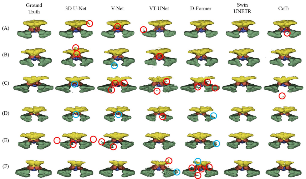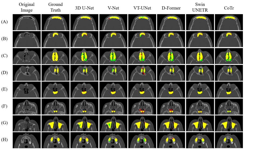 研究采用200例鼻窦炎患者CT数据(176例患者/24例正常对照),通过两名耳鼻喉科专家手动标注建立金标准。主要技术方法包括:1)使用3D U-Net、V-Net代表CNN架构,VT-UNet、D-Former代表ViT架构,Swin UNETR和CoTr作为混合网络;2)采用Jaccard指数(JI)、Dice相似系数(DSC)、95% Hausdorff距离(HD95)等6项指标评估性能;3)通过参数规模(Params)和推理时间(IT)评估计算效率;4)统计方法采用重复测量ANOVA和Bonferroni校正。