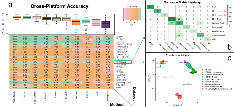 跨平台测试更具挑战性,涉及20对采用不同协议(如10X Chromium与SMART-Seq2)生成的数据集。scSorterDL以0.89的平均准确率领先,在PBMC数据(inDrop→10X转换)中准确识别出相邻UMAP簇中的相似细胞类型。