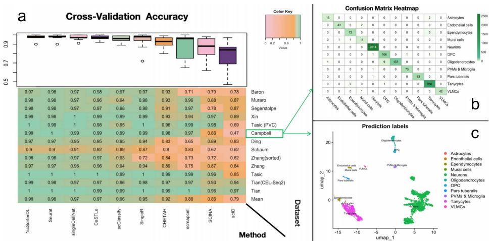 在33个基准实验中,scSorterDL展现出卓越性能。交叉验证实验使用13个数据集(涵盖人/鼠的胰腺、大脑、PBMC等组织),平均准确率达0.98,较第二名Seurat提升13%。