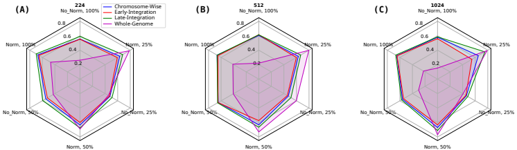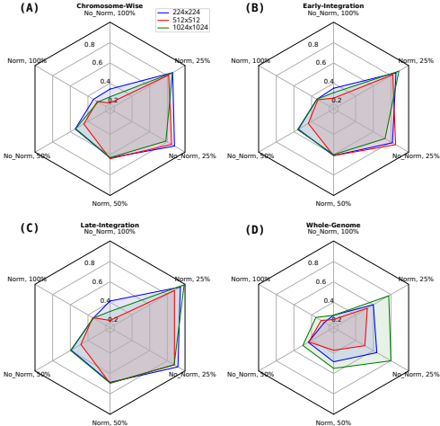 研究团队开发了标准化生物信息学流程:从NCBI SRA和CNCB GSA数据库获取4,312份葡萄样本WGS数据,经BWA比对和bcftools变异检测后,将SNP和indel转换为伪DNA序列。通过CGR算法将序列映射为二维图像(A(0,0)、C(0,1)、G(1,1)、T(1,0)),采用Robust Scaler归一化处理。基于PyTorch框架,系统比较了ResNet18/101、VGG11_bn和ViT_b_16等模型在224×224至1024×1024分辨率下的表现,创新性地设计染色体级、早期整合、晚期整合和全基因组四种集成策略。