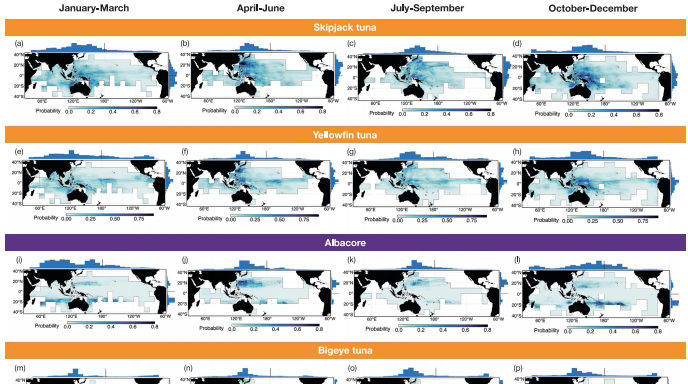 模型结果显示,东中国海、澳大利亚西北海域和东热带太平洋构成三大跨物种产卵热点。其中9个类群在澳大利亚西北海域呈现显著空间重叠,包括南方蓝鳍金枪鱼(Thunnus maccoyii)和蓝枪鱼(Makaira nigricans)等。