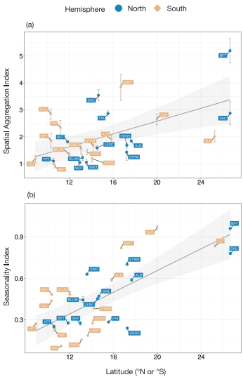 为揭示这一谜题,由Kristine Camille V. Buenafe领衔的国际团队在《Nature Communications》发表重要成果。研究人员创新性地利用1956-1981年间采集的63,017份历史幼虫样本数据,涵盖15个具有生态和商业价值的大型中上层鱼类类群(包括8种金枪鱼、5种旗鱼及相关物种),结合地球系统模型(ESM)输出的17种环境参数,构建了季节性栖息地适宜性模型。通过空间聚集指数和季节性指数的量化分析,结合主成分分析(PCA)识别跨物种幼虫热点,系统评估了产卵策略与纬度、生活史特征的关联规律。