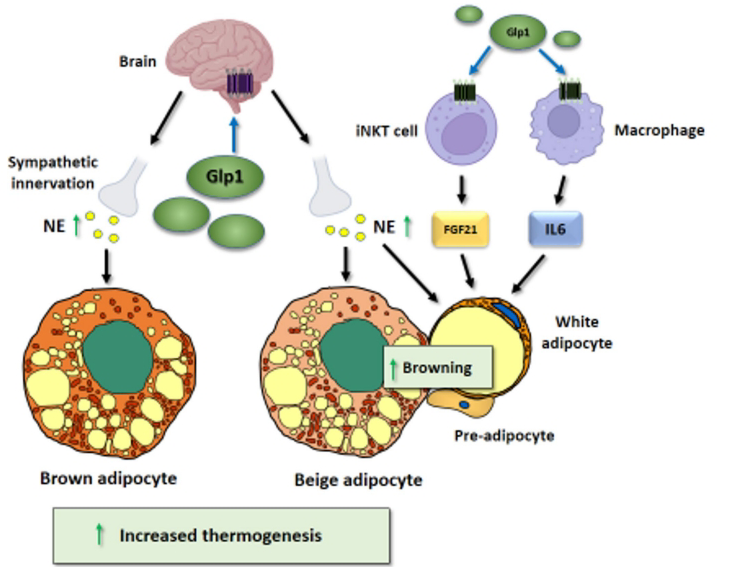 GLP-1R激动剂通过下丘脑室旁核激活交感神经系统,增加BAT活力和WAT褐变。动物实验证实中枢给予exendin-4可增加交感神经输出。
