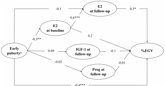 研究团队建立多中心临床队列(安徽合肥2020-2021年入组),采用:1)标准化Tanner分期结合超声辅助评估乳突年龄;2)1.5T及以上场强MRI配合ITK-SNAP软件量化纤维腺体体积(FGV)和百分比(%FGV);3)月经周期第2-5天标准化采血检测雌二醇(E2)、IGF-1等激素;4)结构方程模型(SEM)解析激素介导路径。