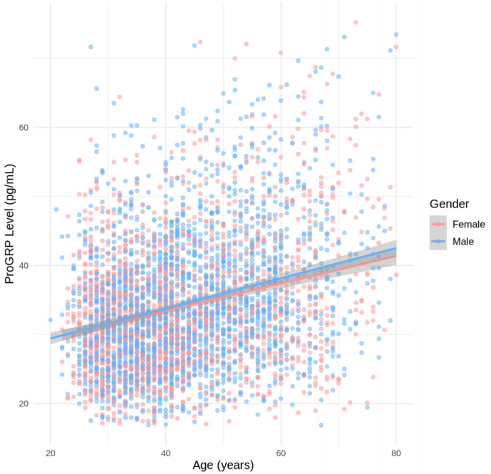 密度分布图显示,虽然男性ProGRP中位数略高(33.08 vs 32.62 pg/mL),但效应量(Cohen's d=0.066)和重叠分布提示无需性别分层。而年龄呈现显著正相关(r=0.24),40岁前保持稳定(30.88-31.62 pg/mL),40-80岁间中位数增长29.9%,97.5百分位数更激增49.8%。