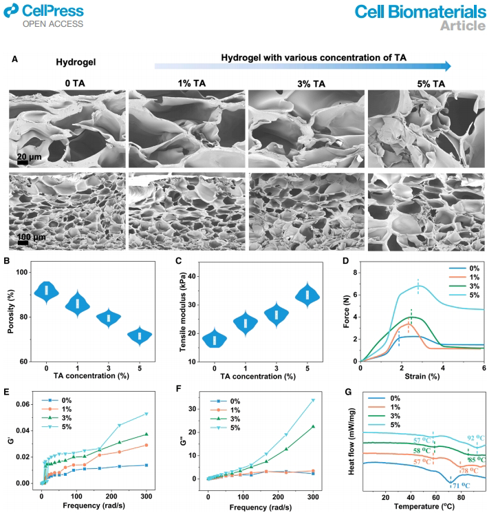 3% TA水凝胶展现最佳平衡性能:拉伸模量提升3倍,自愈合效率达95%,DSC显示分子间结合能提高1.8倍。