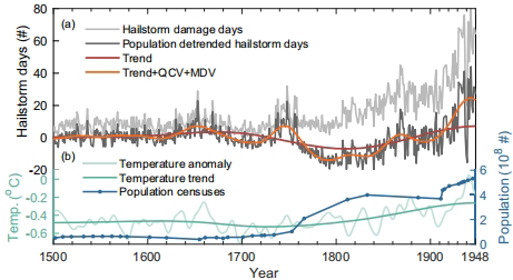 为解决全球变暖背景下冰雹活动变化趋势的科学争议,研究团队利用中国历史文献中的2890年冰雹灾害记录,结合现代气象观测数据,首次揭示了1850年后中国冰雹日数显著增加与地表温度升高的关联性,并发现太平洋年代际振荡(PDO)对冰雹活动的多尺度调控作用。通过卷积神经网络(CNN)模型预测,研究指出21世纪中国冰雹灾害风险将持续加剧,为气候变化适应策略提供了关键科学依据。