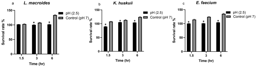 从三种螺肠道中成功分离的L.macroides、K.huakuii和E.faecium均表现出γ-溶血特性(安全指标)和DNase阴性。它们能耐受pH2.5的强酸环境(6小时存活率>97%)和0.7%胆盐浓度,其中E.faecium对全部测试抗生素敏感,而K.huakuii对庆大霉素和四环素耐药。所有菌株均显示出广谱抗菌活性,对金黄色葡萄球菌(Staphylococcus aureus)和铜绿假单胞菌(Pseudomonas aeruginosa)等病原体的抑菌圈达26-32mm。