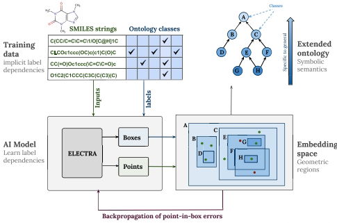 本研究针对化学本体分类中模型难以捕捉层级关系的问题,提出了一种基于几何Box嵌入的新型机器学习架构。通过将ChEBI本体中的化学类表示为n维空间中的盒子(Box),分子结构嵌入为空间点,实现了分类任务与层级关系学习的耦合。实验证明该方法在保持分类性能(F1=0.907)的同时,能自动推导出与ChEBI一致的子类关系(如羧酸→有机酸),并支持零样本扩展新类。该工作为化学知识图谱的动态扩展提供了可解释的几何学习框架。