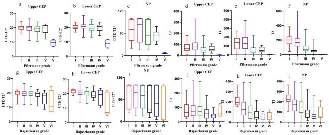 T2*和T2值与Pfirrmann分级呈显著负相关(r=-0.63,P<0.001),在II-III级和IV-V级间差异最显著(P<0.0001),反映退变关键阶段生化成分剧变。