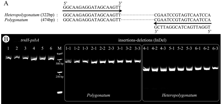 研究团队筛选出563个异黄精属特异性位点、288个黄精特异性位点,开发出两类实用标记:(1)基于IR区156 bp InDel的属级鉴别引物,通过琼脂糖电泳即可区分玉竹属(474 bp)与异黄精属(322 bp);(2)针对rps11基因的物种特异性SNP引物,可一次性鉴别三种药用玉竹。标记经三重重复验证,稳定性良好。