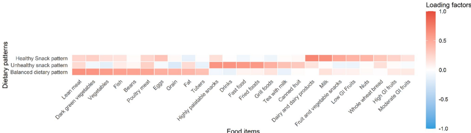 通过因子分析识别出三种典型饮食模式:均衡饮食型(以瘦肉、深色蔬菜为主)、健康零食型(坚果、全麦面包等)和不健康零食型(西式快餐、高脂零食等)。