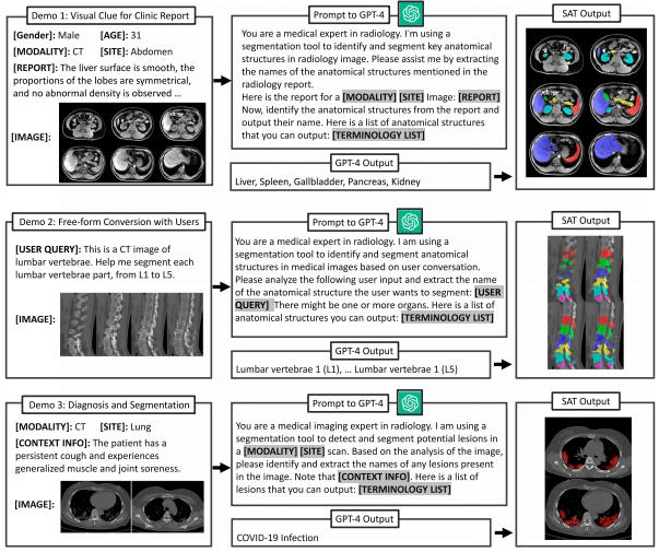 与GPT-4结合实现三大场景:临床报告目标自动解析、自然语言交互分割、基于EHR的病灶定位。