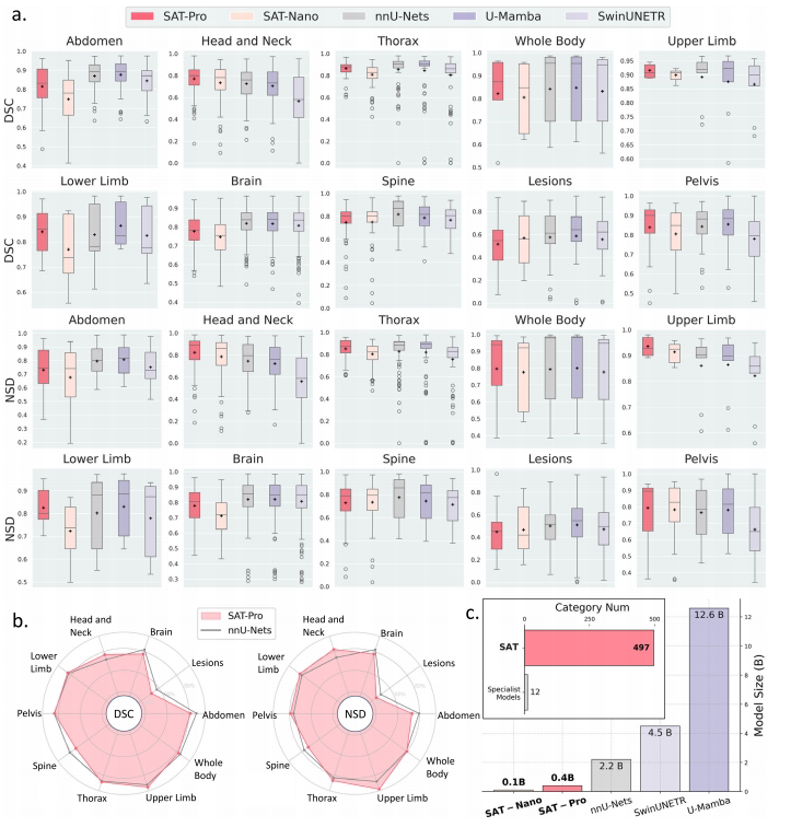 SAT-Pro在头颈、胸部和四肢等区域DSC超越nnU-Net,整体性能与72个专家模型相当(p>0.09),而参数量仅后者20%。