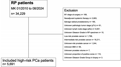 针对这一临床痛点,由Carolin Siech和Philipp Mandel领衔的国际团队在《Prostate Cancer and Prostatic Diseases》发表重要研究成果。研究人员利用德国Martini-Klinik中心2010-2024年间5691例高危前列腺癌患者的临床数据,首次构建了基于EAU指南的ART指征预测模型。研究采用严格的统计学方法,通过单因素和多因素逻辑回归分析筛选预测因子,并利用2000次Bootstrap重采样进行内部验证。