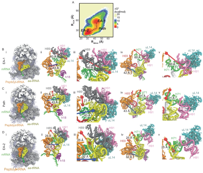 通过测量aa-tRNA与肽基-tRNA间U60-U8距离(Relbow)和A76间距(RCCA),发现人类aa-tRNA采用"3'-CCA端优先"的独特路径。与细菌相比,人类EA-1中间态(Relbow=42?,RCCA=60?)显示出更大空间位移,自由能垒高达11-13.4 kBT(细菌为9.3-10.4 kBT)。