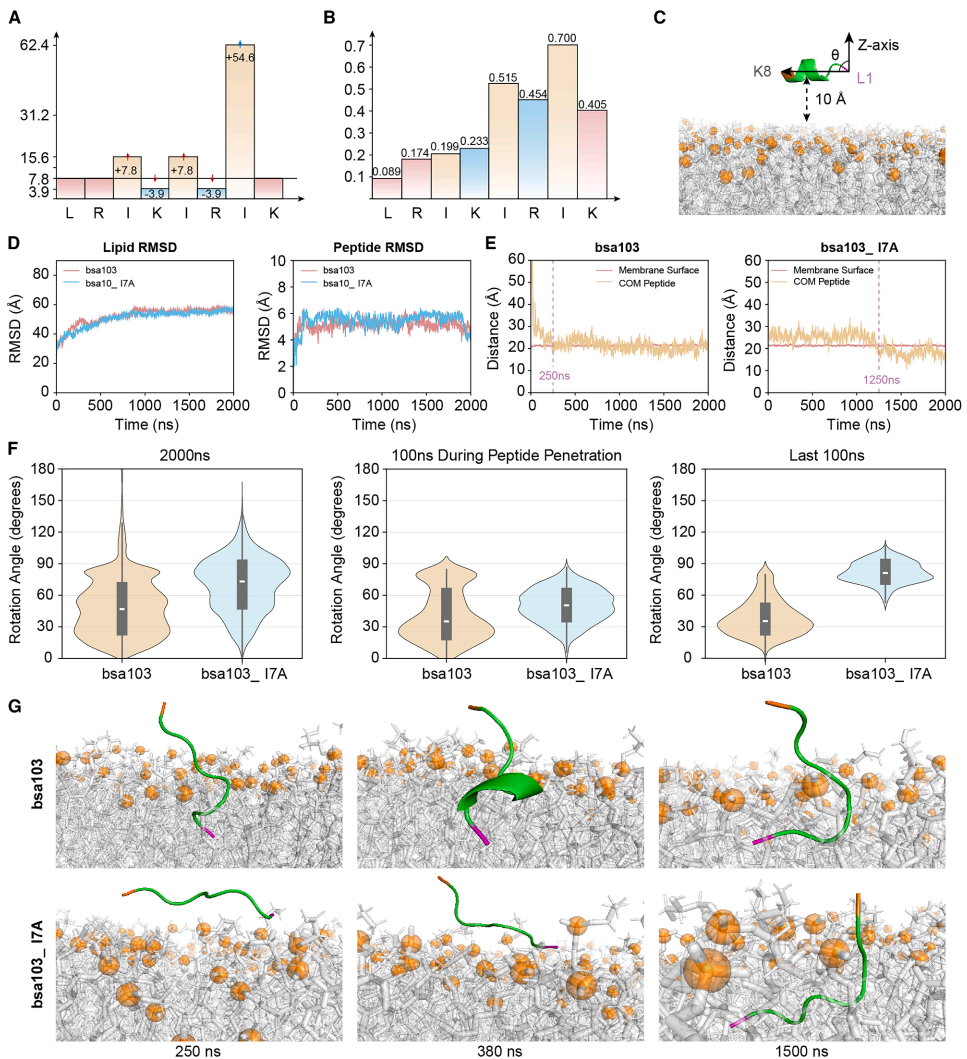 计算解析:注意力权重分析与丙氨酸扫描一致,MD模拟显示bsa103垂直穿透膜结构(250ns)是其高效的关键,而I7A突变体因水平取向导致穿透延迟(1250ns)。