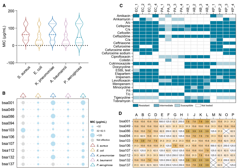 生物活性验证:96条(37.5%)序列对5种ATCC标准菌株有效,其中bsa001对E. coli和A. baumannii的MIC达1.95μg/mL,对16种临床MDR菌株保持2μg/mL活性。