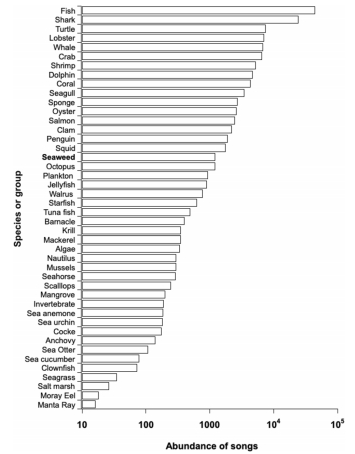 通过对比44类海洋生物主题歌曲,藻类以1,212首位列第17,介于鲨鱼与海豚之间。多样性指数(H′=3.65)显示其文化表达丰富度高于预期,但显著低于鱼类等优势类群。