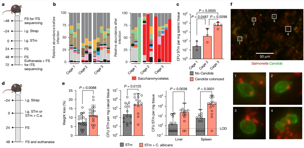研究发现沙门氏菌感染后,小鼠肠道中念珠菌属相对丰度显著增加。通过构建共感染小鼠模型,证实白色念珠菌存在可使沙门氏菌盲肠定植量提高2倍,脾脏和肝脏中的病原体载量增加5-10倍,同时加重50%的体重下降。