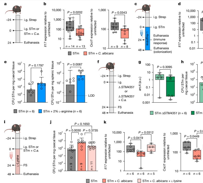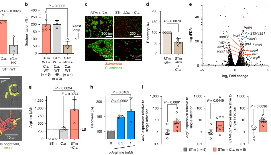 为探究这一问题,Judith Behnsen团队在《Nature》发表了突破性研究成果。研究采用多组学联用策略,结合无菌小鼠模型和体外共培养系统,首次揭示了白色念珠菌通过代谢重编程促进沙门氏菌致病性的分子机制。关键技术包括:1) 16S和ITS测序分析肠道菌群动态变化;2) 荧光显微镜观察微生物空间互作;3) 转录组测序解析沙门氏菌基因表达谱;4) 代谢组检测精氨酸水平变化;5) 基因敲除菌株构建及功能验证;6) 小鼠感染模型评估病理变化。