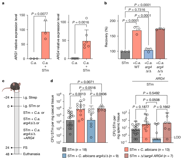 肠道共生真菌白色念珠菌通过精氨酸代谢促进鼠伤寒沙门氏菌毒力增强的跨物种互作机制