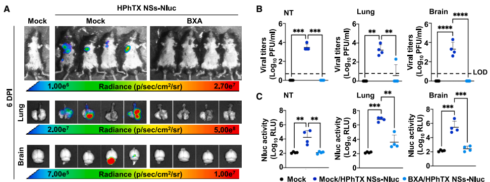 抗病毒药物评估平台:研究证实HPhTX NSs-Nluc可用于快速评估抗病毒药物效果。巴洛沙韦酸(BXA)对该病毒的IC50为0.037 μM,与野生型相当。体内实验显示BXA处理能完全抑制病毒复制,保护小鼠免于死亡。