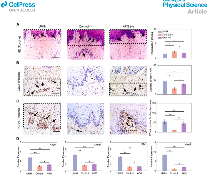 在猪食管损伤模型中,UMIH组毛细血管密度(52.3±6.8个/mm2)显著高于APG组,PCNA阳性细胞比例达68.5%。转录组分析显示Vegfa(血管生成)、Cend1(增殖)、Pfk1(代谢)和Mmp9(基质重塑)基因表达分别上调3.3-9.5倍。Western blot证实其通过激活PI3K/AKT通路促进修复。