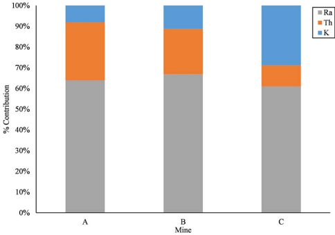 矿区A的ADRA最高(76-137 nGy h-1),显著高于世界均值51 nGy h-1,主要贡献来自238U衰变链(占61-67%)。背景区Welgegund的40K活度(2.98-6.00×10-5 Bq m-3)略高于全球背景值,反映农业活动影响。