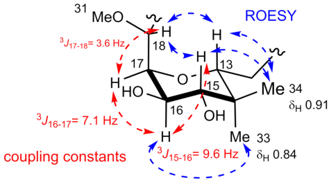 新化合物onnamide G(8)的分子式为C38H63N5O12,与onnamide A(1)相比缺少一个甲氧基,形成独特的双环核心结构。通过核磁数据分析和二维谱图(包括1H-1H COSY、HMBC和ROESY)确定了其平面结构和相对构型,特别是通过ROESY相关确定了四氢吡喃环的椅式构象。