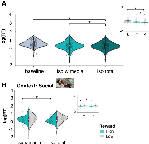 研究采用交叉设计,40名16-19岁青少年完成基线、完全隔离(iso_total)和虚拟社交隔离(iso_with_media)三阶段实验。通过努力奖赏决策任务(EBDM)测量奖赏寻求(记录决策反应时RT),概率反转学习任务(RL)评估强化学习,结合层次贝叶斯模型(如虚构更新模型FU)计算学习率ηpos/ηneg。每小时采集UCLA孤独量表等自评数据,使用线性混合模型分析隔离效应。