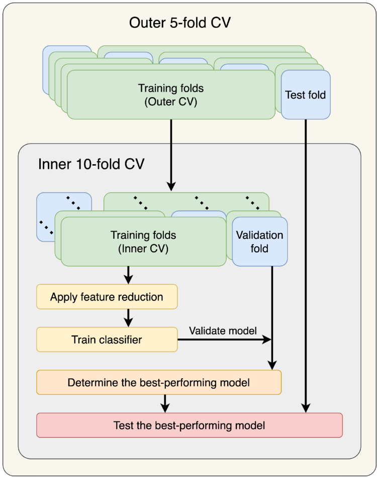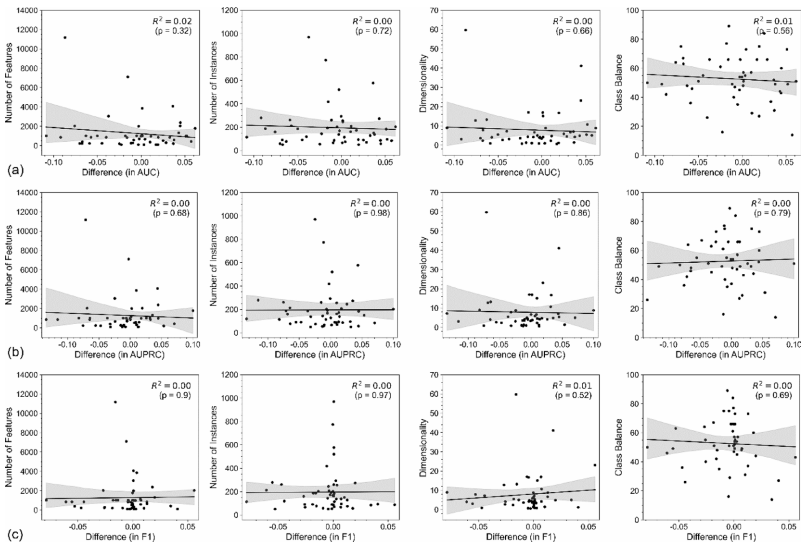 关键技术方法包括:1) 使用radMLBench收集的50个公开影像组学数据集,涵盖CT/MRI多种器官的二元分类任务;2) 采用分层嵌套交叉验证(外层5折、内层10折)进行模型训练与评估;3) 固定特征降维数量(1-32个)以控制变量;4) 通过Friedman检验与Nemenyi事后检验进行统计比较;5) 采用Bland-Altman分析评估方法间一致性。