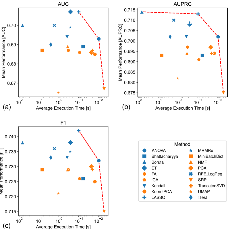 图5显示选择方法普遍更高效,LASSO在性能与速度间达到最佳平衡。而Boruta和Mini-Batch字典学习(MBDL)计算成本显著较高,这为资源受限的研究提供了实用参考。