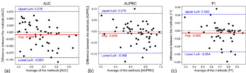 图2的Bland-Altman分析揭示关键洞见:尽管选择方法整体占优,但投影与选择方法的平均差异在所有指标上均可忽略不计(Wilcoxon检验p>0.15)。数据集中存在显著异质性——在WORC-LIPO数据集上,最佳选择方法(Boruta)比最佳投影方法(PCA)的AUC高0.10;而在Zhang2023数据集中,核PCA反超Bhattacharyya距离法0.06。
