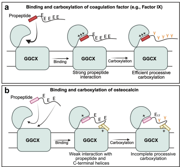 传统认知中,GGCX通过识别凝血因子前肽的高保守序列(FX5AX3L)实现高效羧化。然而骨钙素前肽(EX5GX3V)却打破了这一规律,其结合能力弱且无法激活酶活性。更令人费解的是,去除前肽的成熟骨钙素仍能被羧化,暗示存在未知的识别机制。这些谜团不仅关乎基础生物学认知,更具重要临床意义——选择性调控骨钙素羧化程度可能成为治疗代谢疾病的新靶点。