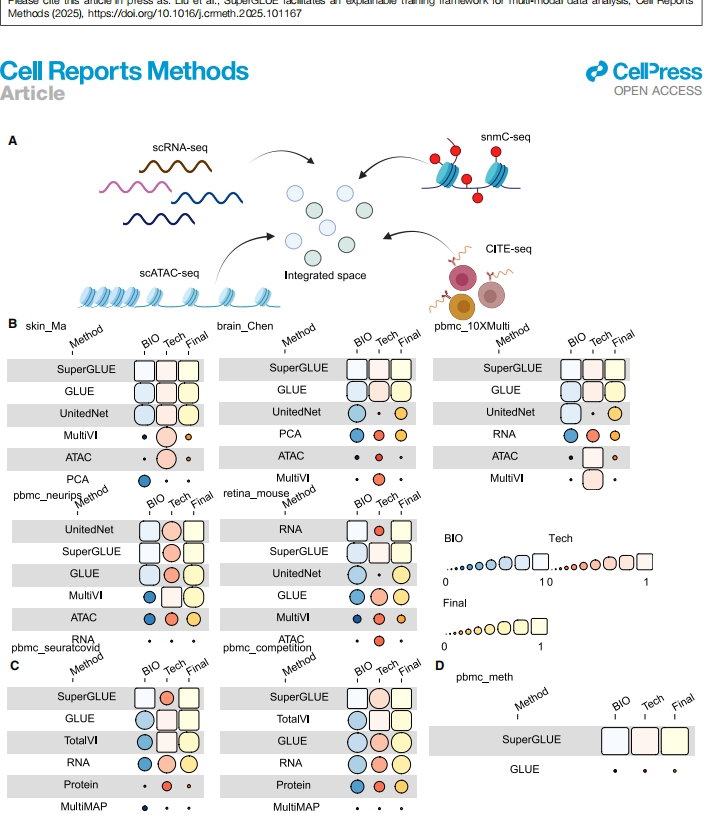 研究人员针对单细胞多模态数据整合中存在的全局/局部结构保留不足、特征关系解释性差等问题,开发了SuperGLUE框架。该框架通过概率深度学习与图扰动统计检验,实现了跨模态数据的精准整合与可解释性分析,在保留生物结构、推断调控网络等方面优于现有方法,为多组学数据驱动的生物学发现提供了新工具。